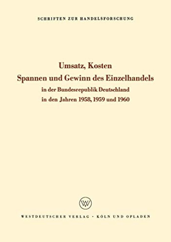 Textteil.- A. Die Methode des Betriebsvergleichs.- 1. Erhebungsteilnehmer.- 2. Erhebungsgrundlagen.- 3. Erhebungsdurchführung.- 4. Auswertungsverfahren.- 5. Auswertungsberechnungen.- 6. Auswertungsbekanntgabe.- 7. Erläuterungen der bei der Erhebung und der Auswertung verwandten Begriffe in alphabetischer Anordnung.- B. Charakterisierung der am Betriebsvergleich teilnehmenden Firmen.- 1. Branchengliederung.- 2. Größenklassengliederung.- 3. Örtliche Verteilung nach Ländern, Ortsgrößen und Geschäftslagen.- 4. Größe des Geschäftsraumes.- 5. Personenzahl und Personengliederung.- 6. Zusammensetzung der Warensortimente.- 7. Repräsentationsgrad der am Betriebsvergleich beteiligten Betriebe.- C. Umsatz, Kosten, Spannen und Gewinn in Jahreszahlen.- 1. Beschaffung, Lagerung, Absatz und Handlungskosten im Gesamtvergleich.- 2. Beschaffung.- 3. Lager.- 4. Absatz.- a) Absatzleistungszahlen.- b) Absatzarten.- c) Kreditverkäufe und Außenstände.- 5. Handlungskosten.- 6. Betriebshandelsspanne und Betriebsergebnis.- 7. Absatz-, Lager-, Kosten- und Ertragszahlen nach Personenabsatzklassen.- 8. Beschaffungs-, Lager-, Absatz- und Kostenzahlen nach den Standortmerkmalen Land und Ortsgröße.- D. Umsatz und Kosten in Monats- und Quartalszahlen.- 1. Beschaffungs-, Lager- und Absatzindex für die vier Hauptgruppen des Einzelhandels und den gesamten Einzelhandel.- 2. Vierteljährliche Branchen- und Teilbranchenzahlen der Beschaffung, des Absatzes und der Handlungskosten.- E. Veröffentlichungen des Instituts für Handelsforschung über den Betriebsvergleich in den Jahren 1958, 1959 und 1960.- Tabellenteil.- Tabelle 1: Gliederung der in den Jahresauswertungen 1958, 1959 und 1960 erfaßten Teilnehmer am Betriebsvergleich des Einzelhandels nach Branchen und Teilbranchen.- Tabelle 2:Gliederung der in den Jahresauswertungen 1958, 1959 und 1960 erfaßten Teilnehmer am Betriebsvergleich des Einzelhandels nach Branchen und Personengrößenklassen.- Tabelle 3: Gliederung der in den Jahresauswertungen 1958, 1959 und 1960 erfaßten Teilnehmer am Betriebsvergleich des Einzelhandels nach Branchen und Absatzgrößenklassen.- Tabelle 4: Gliederung der in den Jahresauswertungen 1958, 1959 und 1960 erfaßten Teilnehmer am Betriebsvergleich des Einzelhandels nach Branchen und Ländern.- Tabelle 5: Gliederung der in den Jahresauswertungen 1958, 1959 und 1960 erfaßten Teilnehmer am Betriebsvergleich des Einzelhandels nach Branchen und Ortsgrößen.- Tabelle 6: Gliederung der in den Jahresauswertungen 1958, 1959 und 1960 erfaßten Teilnehmer am Betriebsvergleich des Einzelhandels nach Branchen und Geschäftslagen.- Tabelle 7: Die Größe des Geschäftsraumes je Einzelhandelsbetrieb in Quadratmetern im Durchschnitt der Branchen und Personengrößenklassen in den Jahren 1958, 1959 und 1960.- Tabelle 8: Die Größe des Geschäftsraumes je Einzelhandelsbetrieb in Quadratmetern im Durchschnitt der Branchen und Absatzgrößenklassen in den Jahren 1958, 1959 und 1960.- Tabelle 9: Die Zahl der beschäftigten Personen je Einzelhandelsbetrieb im Durchschnitt der Branchen und Personengrößenklassen in den Jahren 1958, 1959 und 1960.- Tabelle 10: Die Zahl der beschäftigten Personen je Einzelhandelsbetrieb im Durchschnitt der Branchen und Absatzgrößenklassen in den Jahren 1958, 1959 und 1960.- Tabelle 11: Der Anteil der Inhaber oder Leiter, der mithelfenden Familienangehörigen, der Lehrlinge und der Werkstattpersonen in Prozenten der Gesamtzahl der Betriebspersonen im Durchschnitt der Branchen im Jahre 1960.- Tabelle 12: Die Zusammensetzung der Warensortimente nach denHauptwarengruppen in Prozenten des Absatzes im Durchschnitt der Branchen in den Jahren 1958, 1959 und 1960.- Tabelle 13: Vergleich der im Jahre 1960 am Betriebsvergleich beteiligten Betriebe und des von ihnen erzielten Absatzes mit den entsprechenden Zahlen der Umsatzsteuerstatistik 1960 in der Bundesrepublik Deutschland.- Tabelle 14: Die Entwicklung von Beschaffung, Lager, Absatz und Handlungskosten im Durchschnitt der Branchen in den Jahren 1958, 1959 und 1960 (1949 = 100).- Tabelle 15: Die Entwicklung von Beschaffung, Absatz und Handlungskosten im Durchschnitt der Branchen sowie der Personen- und Absatzgrößenklassen in den Jahren 1958, 1959 und 1960 (1958 = 100).- Tabelle 16: Die Beschaffungswege in Prozenten der gesamten Warenbesdiaffung im Durchschnitt der Personengrößenklassen in den Jahren 1958, 1959 und 1960.- Tabelle 17: Die Beschafiungswege in Prozenten der gesamten Warenbesdiaffung im Durchschnitt der Absatzgrößenklassen in den Jahren 195 8, 1959 und 1960.- Tabelle 18: Entwicklung des Lagerbestandes, Umschlagsgeschwindigkeit und Lagerbestand je beschäftigte Person in DM im Durchschnitt der Branchen in den Jahren 1958, 1959 und 1960.- Tabelle 19: Die Umschlagsgeschwindigkeit des Warenlagers im Durchschnitt der Branchen und Personengrößenklassen in den Jahren 1958, 1959 und 1960.- Tabelle 19a: Die Umschlagsgeschwindigkeit des Warenlagers im Durchschnitt der Branchen und Absatzgrößenklassen in den Jahren 1958, 1959 und 1960.- Tabelle 20: Der Lagerbestand je beschäftigte Person in DM im Durchschnitt der Branchen und Personengrößenklassen in den Jahren 1958, 1959 und 1960.- Tabelle 20a: Der Lagerbestand je beschäftigte Person in DM im Durchschnitt der Branchen und Absatzgrößenklassen in den Jahren 1958, 1959 und 1960.- Tabelle 21: Gesamtsumme desAbsatzes, Absatz je Betrieb, Absatz je beschäftigte Person, Absatz je Kunde, Absatz je Quadratmeter Geschäftsraum und Absatz je Quadratmeter Verkaufsraum in DM im Durchschnitt der Branchen in den Jahren 1958, 1959 und 1960.- Tabelle 22: Der Absatz je Betrieb in DM im Durchschnitt der Branchen und Personengrößeniklassen in den Jahren 1958, 1959 und 1960.- Tabelle 23: Der Absatz je Betrieb in DM im Durchschnitt der Branchen und Absatzgrößenklassen in den Jahren 1958, 1959 und 1960.- Tabelle 24: Der Absatz je beschäftigte Person in DM im Durchschnitt der Branchen und Personengrößenklassen in d