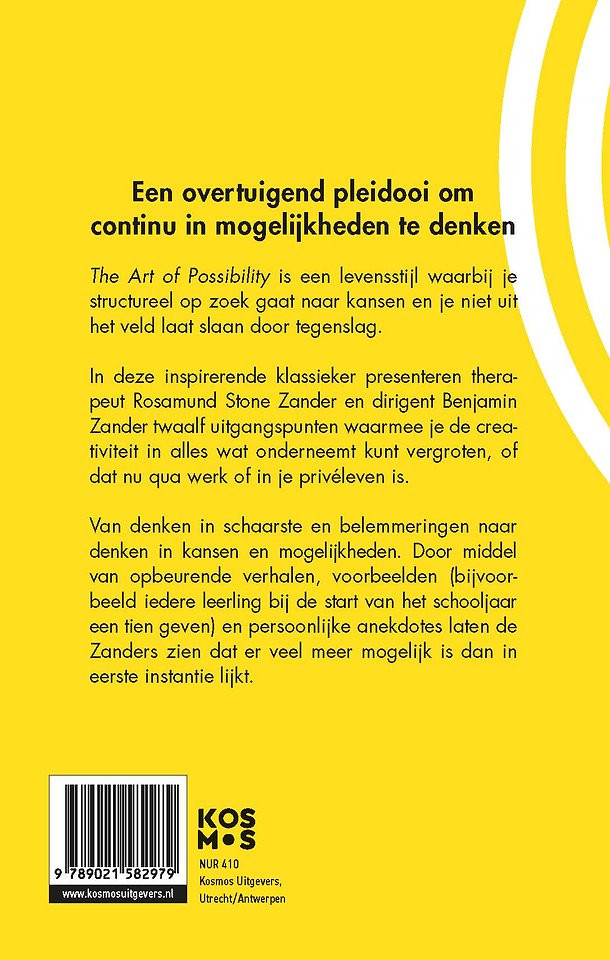 In deze inspirerende klassieker presenteren therapeut Rosamund Stone Zander en dirigent Benjamin Zander twaalf uitgangspunten waarmee je de creativiteit in alles wat onderneemt kunt vergroten, od dat nu qua werk of in je privéleven is.