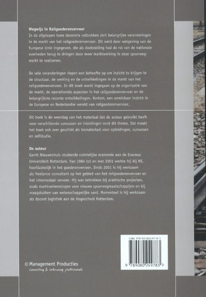 De vele veranderingen riepen een behoefte op om inzicht te krijgen in de structuur, de werking en de ontwikkelingen in de markt van het railgoederenvervoer. In dit boek wordt ingegaan op de organisatie van de markt, de operationele aspecten in het railgoederenvervoer en de belangrijkste recente ontwikkelingen. Een onmisbaar inzicht in de Europese en Nederlandse wereld van railgoederenvervoer.