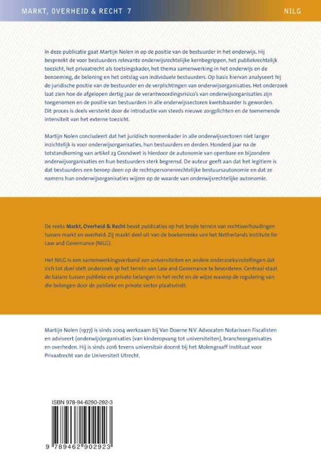 In deze publicatie gaat Martijn Nolen in op de positie van de bestuurder in het onderwijs. Hij bespreekt de voor bestuurders relevante onderwijsrechtelijke kernbegrippen, het publiekrechtelijk toezicht, het privaatrecht als toetsingskader, het thema samenwerking in het onderwijs en de benoeming, de beloning en het ontslag van individuele bestuurders. Op basis hiervan analyseert hij de juridische positie van de bestuurder en de verplichtingen van onderwijsorganisaties. Het onderzoek laat zien hoe de afgelopen dertig jaar de verantwoordingsrisico’s van onderwijsorganisaties zijn toegenomen en de positie van bestuurders in alle onderwijssectoren kwetsbaarder is geworden. Dit proces is deels versterkt door de introductie van steeds nieuwe zorgplichten en de toenemende intensiteit van het externe toezicht.